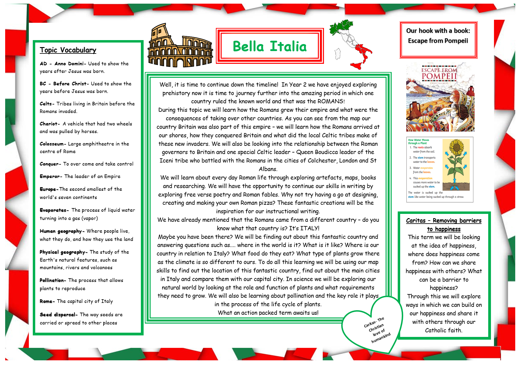 Maybe you have been there? We will be finding out about this fantastic country and answering questions such as.....where in the world is it? What is it like? Where is our country in relation to Italy? What food do they eat? What type of plants grow there as the climate is so different to ours. To do all this learning we will be using our map skills to find out the location of this fantastic country, find out about the main cities in Italy and compare them with our capital city. In science we will be exploring our natural world by looking at the role and function of plants and what requirements they need to grow. We will also be learning about pollination and the key role it plays in the process of the life cycle of plants.